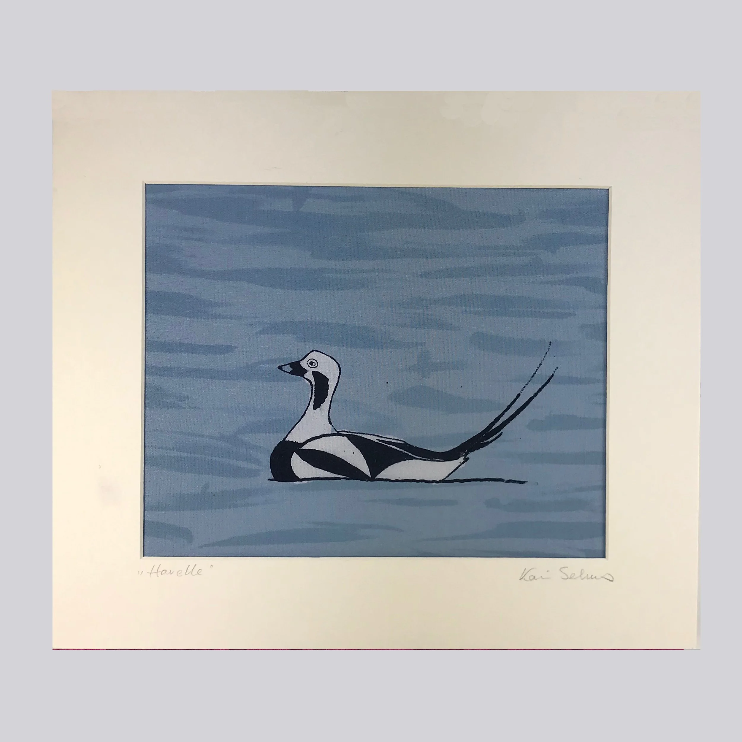 "Havelle", silketrykk på bomull, montert i passepartout. 30x35cm, kr.900,-.