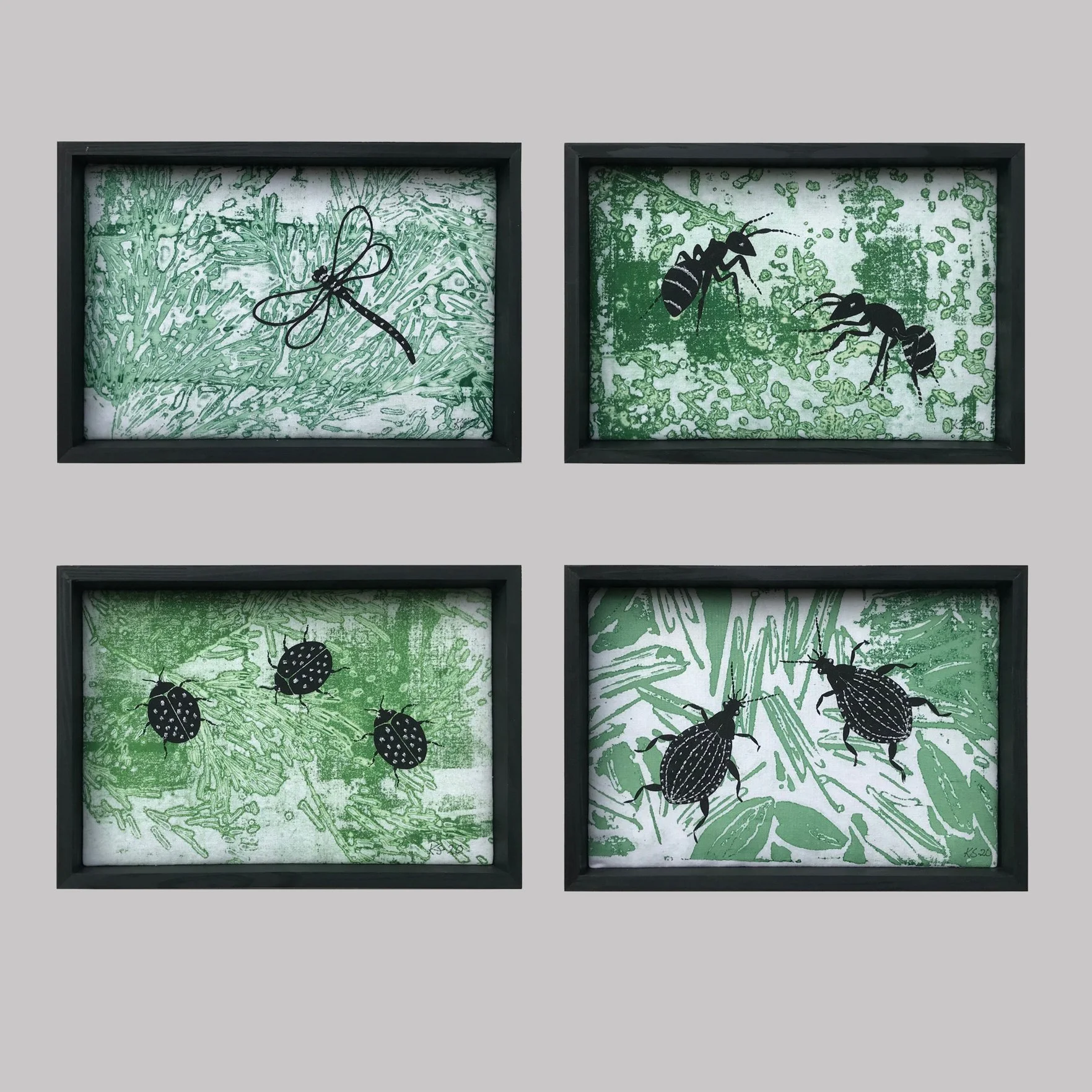 Silketrykk med div. småkryp grønn, 32x42cm, kr. 1500 pr.stk.