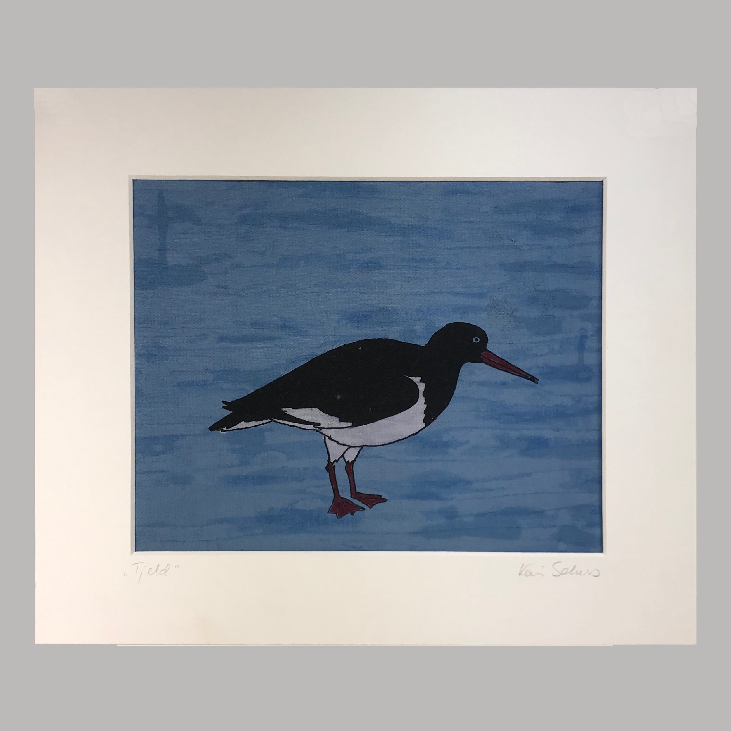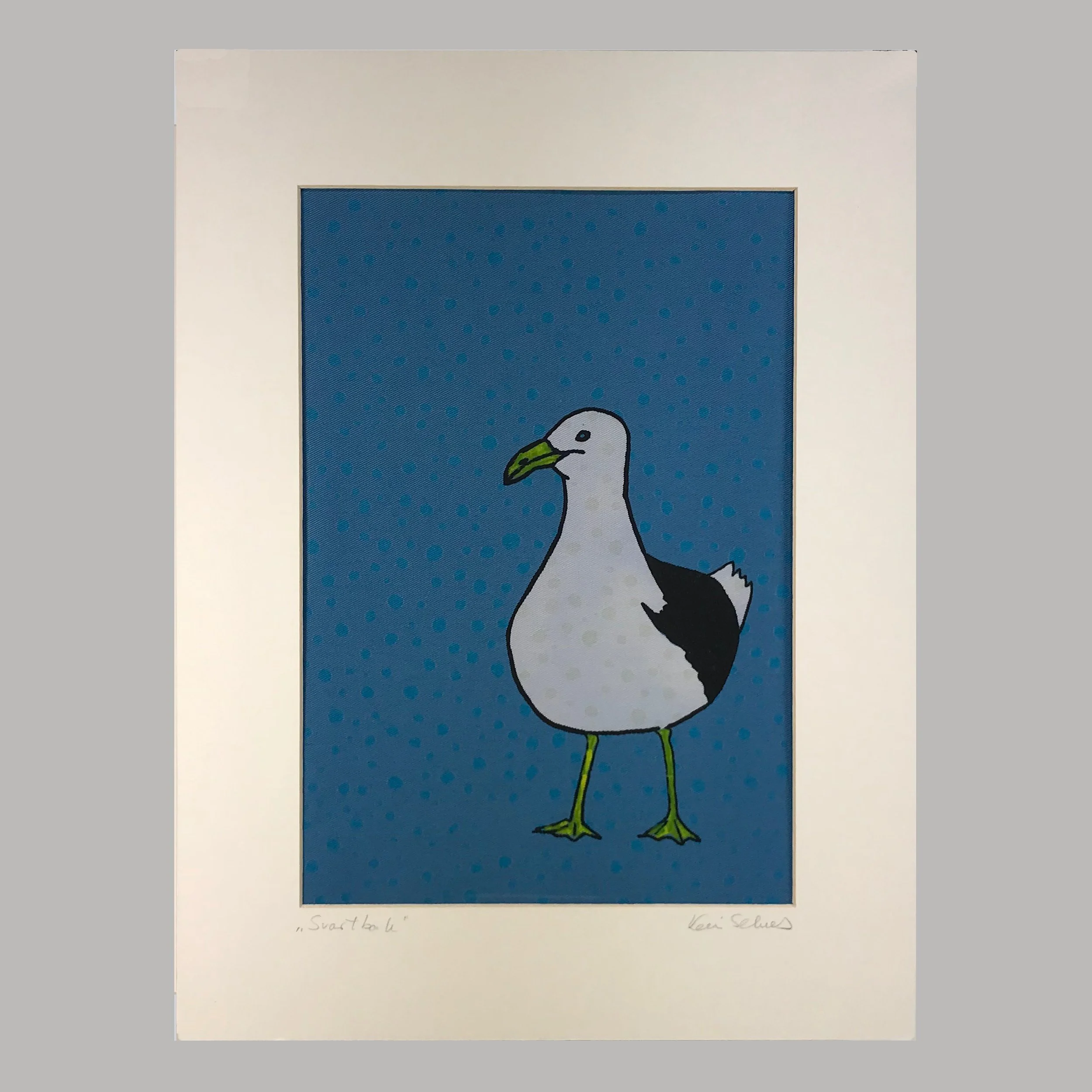 "Svartbak", silketrykk på bomull, montert i passepartout. 40x30cm, kr. 900,-.