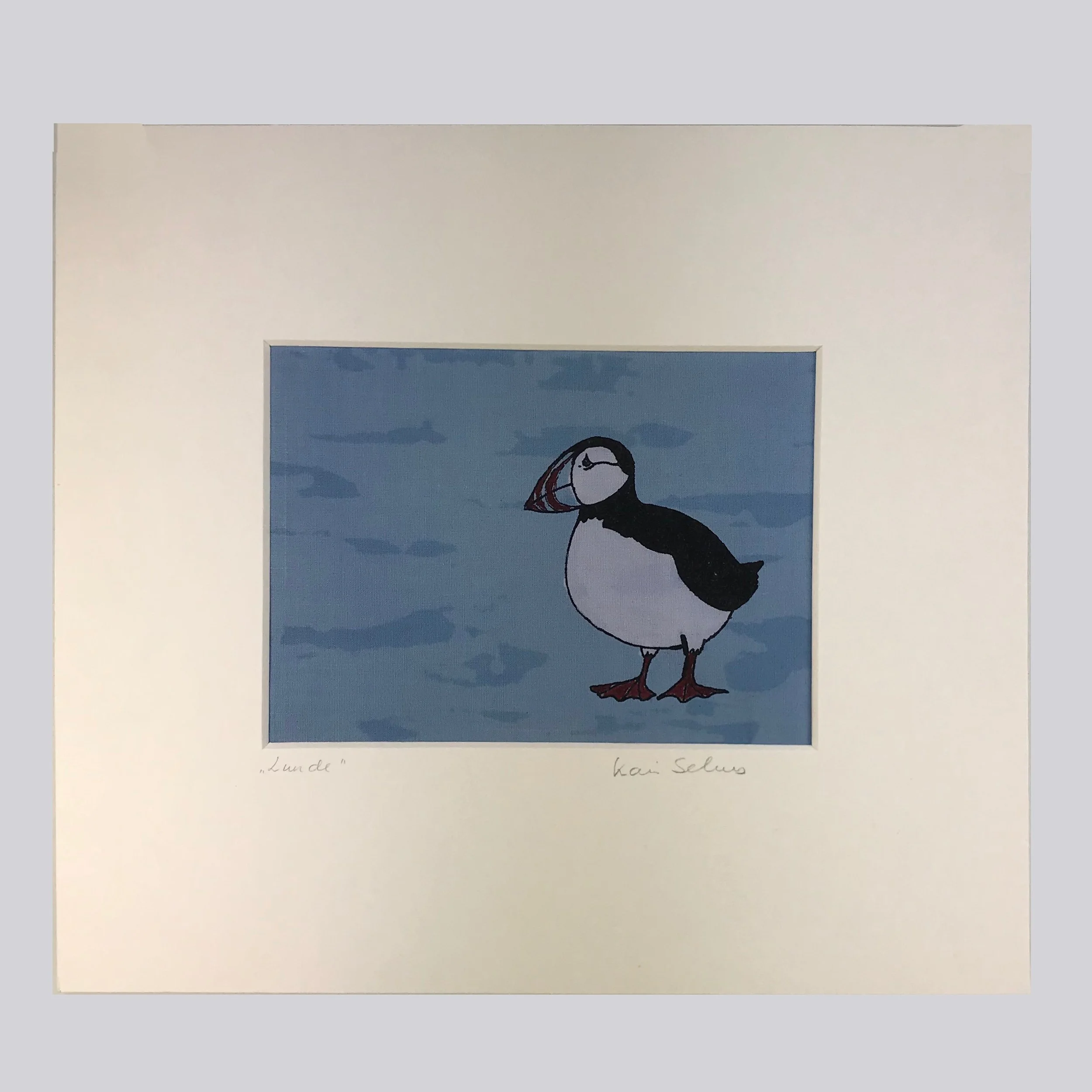 "Lunde", silketrykk på bomull, montert i passepartout. 28x32cm, kr.700,-.