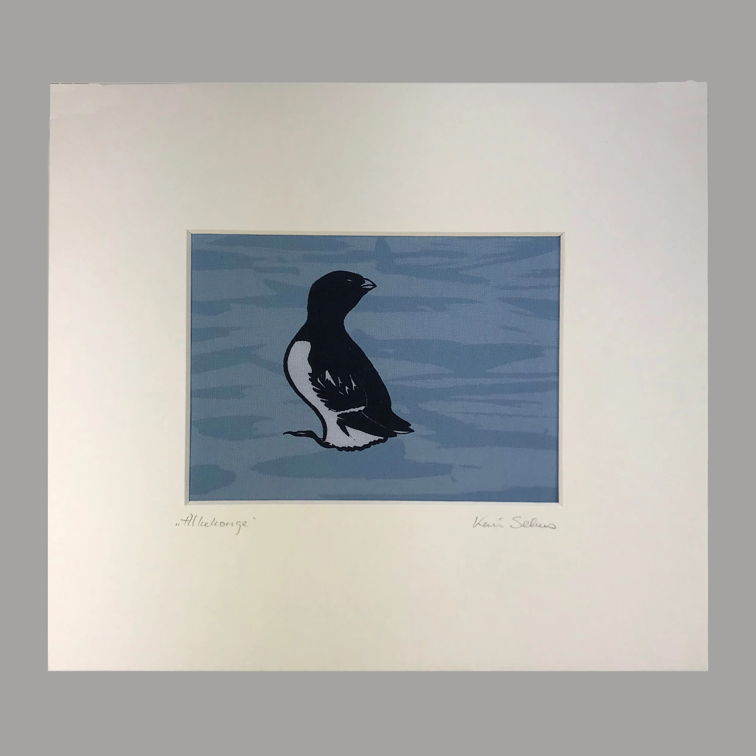 Bildeserie “Sjøfugl”. Silketrykk på bomull. Montert i passepartout.